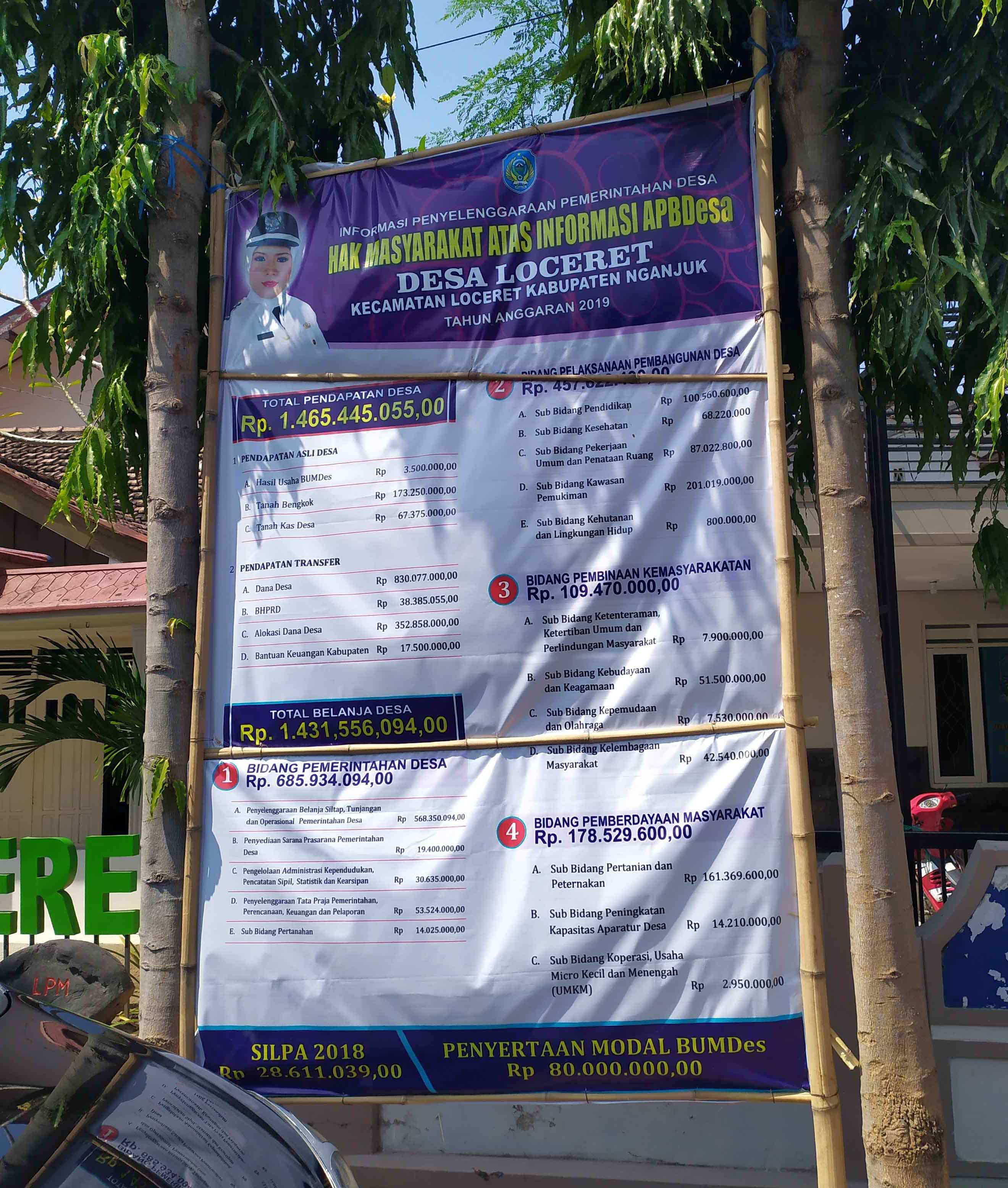 Pemasangan banner Anggaran Pendapatan dan Belanja Desa (APBDES) Desa Loceret tahun 2019 di depan Kantor Desa Loceret bertujuan untuk memberikan informasi tentang segala aktifitas dan kegiatan desa kepada masyarakat desa berupa pengelolaan dana desa dan pelaksanaan berupa rencana-rencana program yang dibiayai dengan uang desa.
